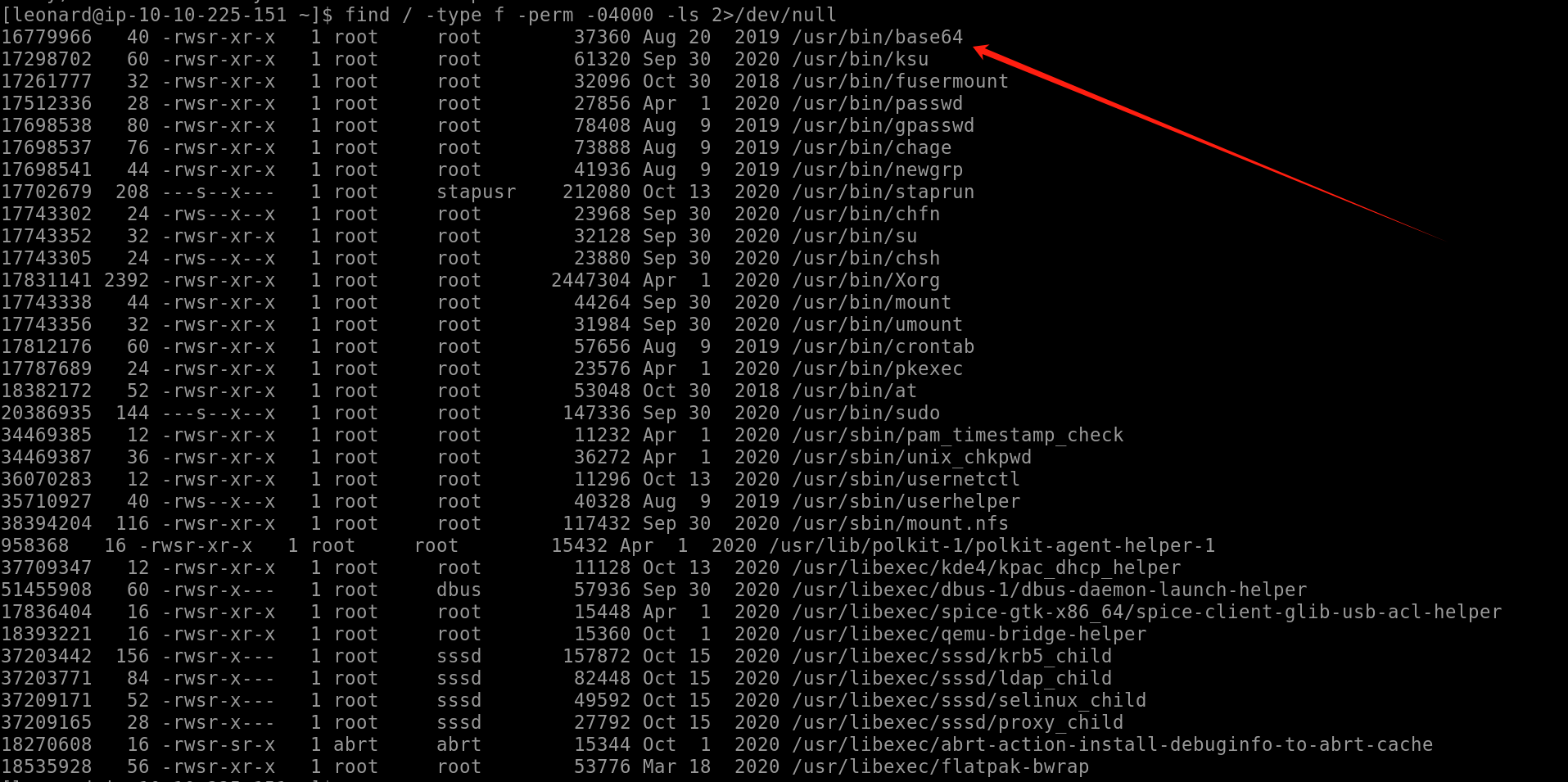 发现base64被设置了SUID权限,所有人利用base64,将以root权限执行