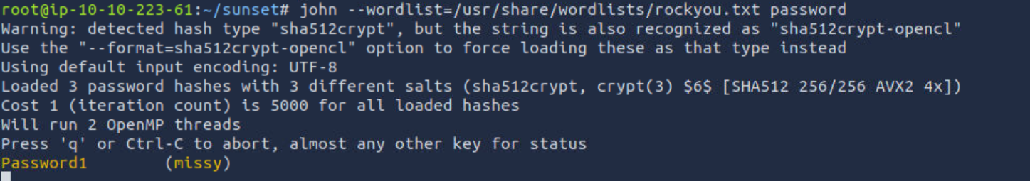 john --wordlist=/usr/share/wordlists/rockyou.txt password